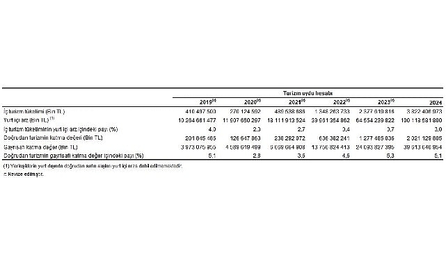 Ülkemizdeki turizm amaçlı toplam tüketim değeri 2024 yılında 3 trilyon 822 milyar 406 milyon 973 bin TL olarak gerçekleşti. Turizm amaçlı toplam tüketim değerinin toplam yurt içi arz içerisindeki payı %3,8 oldu.